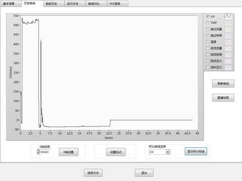 6) 可根據(jù)工藝要求在系統(tǒng)中靈活配置流量、溫度、電導(dǎo)率、pH、UV等在線檢測器,實時記錄運行曲線;
