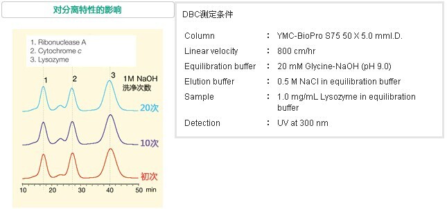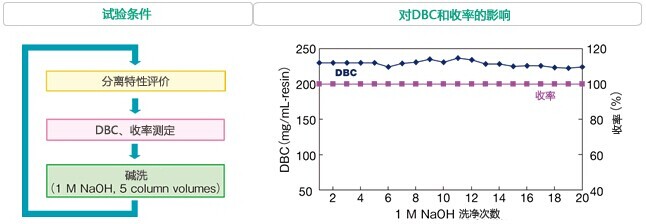 對(duì)于蛋白質(zhì)純化用色譜柱的清洗/殺菌常采用堿性溶液進(jìn)行定位清洗的方法(CIP:cleaning in place)。YMC-BioProl離子交換填料因?yàn)榫哂凶吭降哪蛪A性,所以即使使用1M NaOH實(shí)施20次的CIP也能維持高DBC和收率,而不會(huì)發(fā)生分離特性的改變。