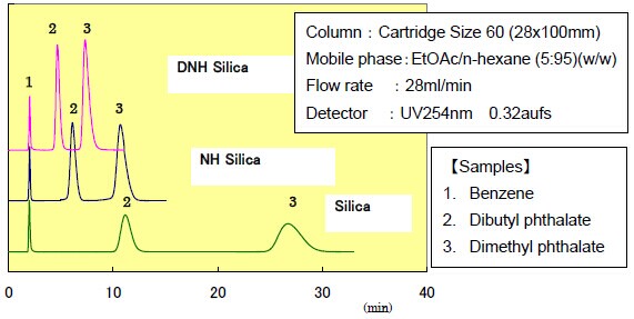 ? ?DNH硅膠鍵合的二元胺和一元胺是NH硅膠的2倍?;谶@個原因,DNH硅膠的堿度要比NH硅膠強,并且由于碳鏈較長,DNH硅膠的氫鍵作用要比NH硅膠弱一些。因此,DNH硅膠的流動相要選擇極性小的溶劑,因為DNH硅膠的洗脫速度要比普通的裸硅膠和NH硅膠快。