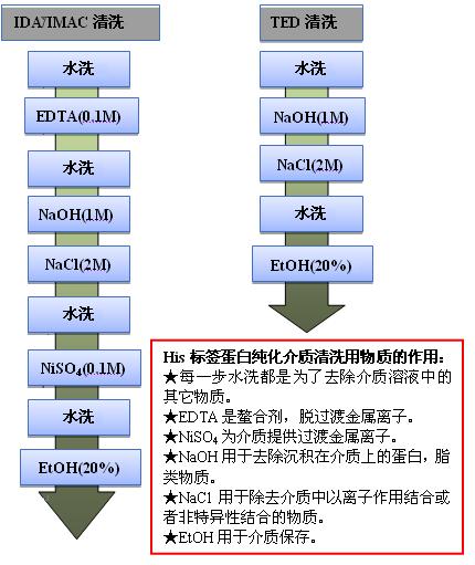 過渡態(tài)金屬離子(Cu2+>Ni2+>Zn2+>Co2+ )能夠與電子供體,如N、S、O 等原子以配位鍵結(jié)合,金屬離子上剩余的空軌道是電子供體的配位點,在溶液中會被水分子或陰離子占據(jù),當?shù)鞍踪|(zhì)表面氨基酸殘基(His)與金屬離子的結(jié)合力較強時,氨基酸殘基的供電原子就會與金屬離子結(jié)合形成復(fù)合物,取代原先結(jié)合的水分子或陰離子,這樣就能使蛋白質(zhì)分子結(jié)合在固體表面。His標簽蛋白的His和介質(zhì)結(jié)合,由于蛋白質(zhì)表面的氨基酸的種類、數(shù)量、位置和空間構(gòu)象不同,因而具體使用時根據(jù)金屬配基的親和力大小不同,選擇不同的金屬配基進行分離純化。