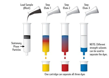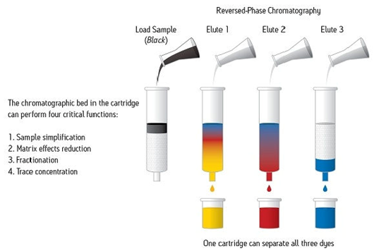 SPE通常是一種使用裝在柱芯型裝置內的固體顆粒和色譜填充材料對樣品中的不同組分進行化學分離的樣品制備技術。樣品幾乎始終呈液態(tài),但特殊應用項目可能使用氣相中的某些樣品進行。圖1顯示出一份樣品(圖示為黑色)正在使用SPE裝置進行處理,以使組成該樣品的每種染色組分通過色譜分析實現分離。