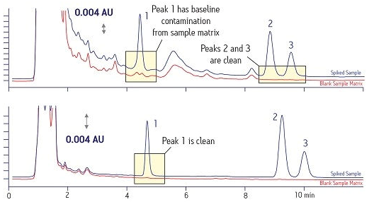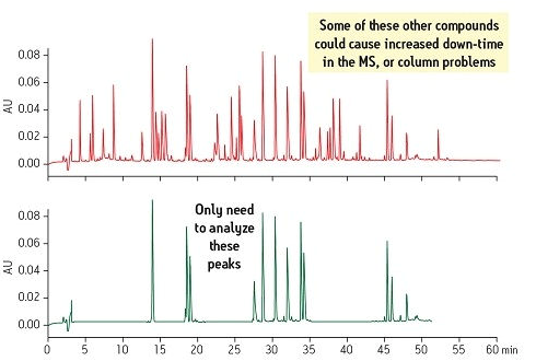 另一種考慮是存在于樣品基質中的各種干擾物在每次進樣時可能會蓄積導致儀器停機。如果這些干擾物能在樣品制備期間被除去,那么目標化合物就能使用一種更簡單、更穩(wěn)定的方法進行分析(圖3)。此圖將位于靠上位置的原始樣品與位于靠下位置的經SPE制備后的新樣品進行了比較。