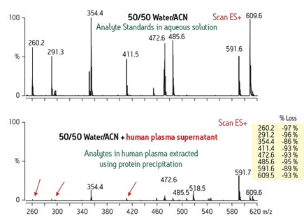 復雜樣品基質帶來的第二種問題在我們觀察質譜輸出圖譜(LC/MS或LC/MS/MS)時可以看到。為了獲得適當的質譜響應信號(靈敏度),必須使該化合物離子化。如果該化合物離子的形成因樣品基質干擾物而受阻,那么相應的信號強度也會大大減弱。