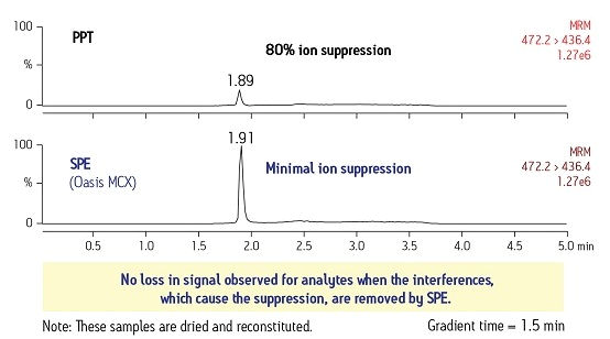 在有些情況下,源自樣品基質的干擾物可能會增加某種化合物的信號,這叫做離子增強,可導致響應值偏高。適當的SPE方法可通過將干擾物與該化合物分離開來而最大限度減弱這種效應,從而使響應值更準確。