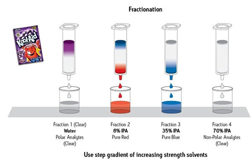圖8給出了關于SPE分餾效力的一個示例。在這里,一種復雜的干粉樣品(紫葡萄混合飲品)被輕易分離成4種餾分:1種完全由極性化合物組成的餾分、1種純化型紅色化合物、1種純化型藍色化合物和1種包含所有其余非極性化合物的餾分。