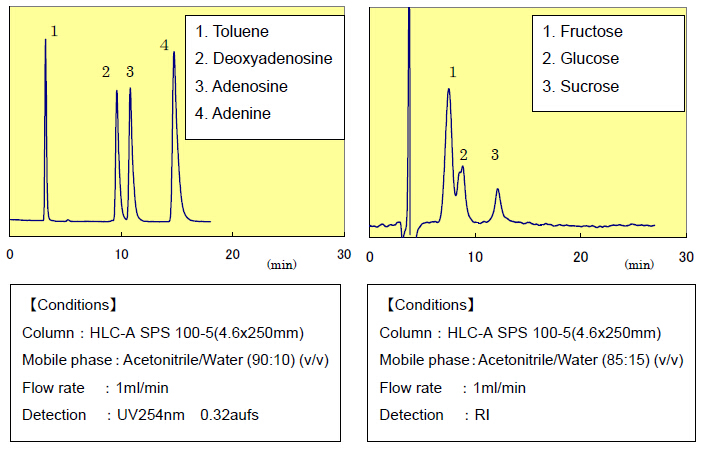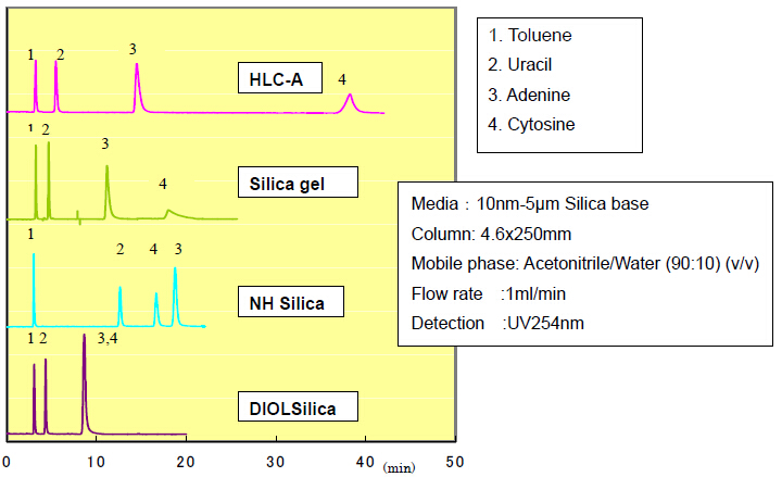 ????因此,對(duì)于極性化合物的洗脫,HILIC模式和反相模式是互補(bǔ)的。富士硅化學(xué)有限公司開(kāi)發(fā)了兩款HILIC模式的填料,命名為“HLC”硅膠。兩種HLC硅膠都含有兩性的官能團(tuán),共價(jià)鍵合在硅膠表面?!?/span>HLC-A”用于分離純化有機(jī)酸、核酸和糖類;“HLC-P”用于分離氨基酸、多肽。