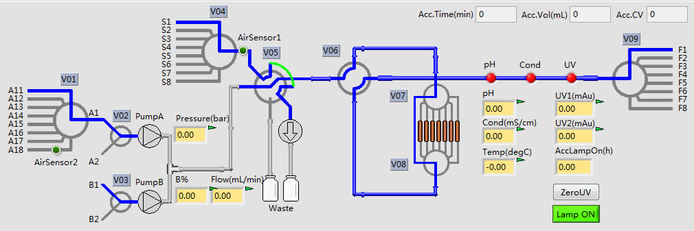 6、全自動柱流向切換閥門,可實(shí)現(xiàn)層析柱正、反向流動及旁路功能;
