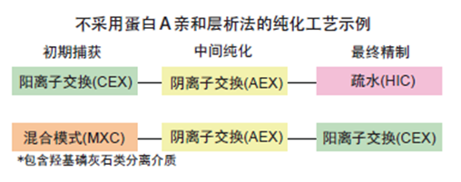 ??? 不采用蛋白A親和層析法的純化工藝可降低工藝成本??赏ㄟ^結(jié)合使用陽離子交換層析法 ( CEX ) 、陰離子交換 層析法 ( AEX )、疏水相互作用層析法 ( HIC ) 以及混合模式層析法 ( MXC ) 實(shí)現(xiàn)對(duì)單抗的高純度純化制備。
