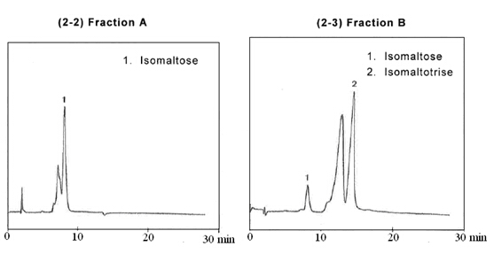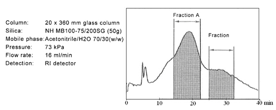 ? ? ? 糖類物質(zhì)的分析和制備,在液相色譜領(lǐng)域占有重要的地位。迄今為止,大多數(shù)的分離介質(zhì)僅僅局限在分析級(jí)別。但是富士硅膠研發(fā)出用于制備色譜的新的氨基硅膠。當(dāng)使用高水相為流動(dòng)相時(shí),一般的氨基填料會(huì)暴露出很多問(wèn)題。氨基硅膠的pH值很高,一般pH為9.0,在這樣高的pH條件下,目標(biāo)化合物一般都會(huì)變性,并且會(huì)毀壞硅膠基質(zhì)的表面??紤]到這些問(wèn)題,富士公司研發(fā)出新的氨基硅膠填料,稱之為NH SG硅膠。NH SG硅膠可以最小化甚至是避免上述問(wèn)題,并且對(duì)糖類化合物進(jìn)行更好的分離。