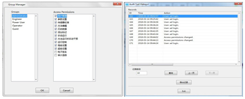 系統(tǒng)采用五級用戶管理權限,可對用戶權限進行自定義分配,并可在運行中更換用戶(便于交接班)。完善的審計追蹤及電子簽名功能,符合cGMP法規(guī)要求。