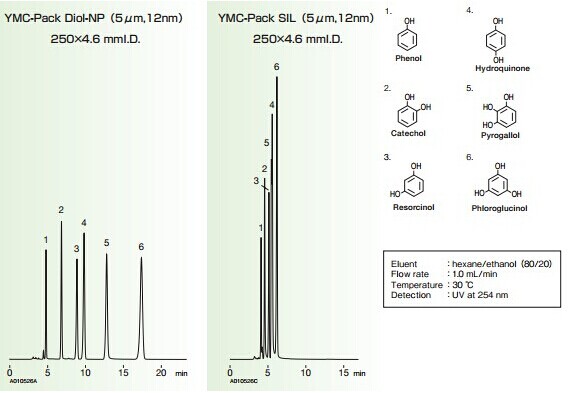 上圖顯示了苯酚在YMC-Pack Diol-NP色譜柱和YMC-Pack SIL色譜柱上在相同條件下的不同選擇性,YMC-Pack Diol-NP色譜柱提供更長(zhǎng)的保留時(shí)間和更好的分離效果。