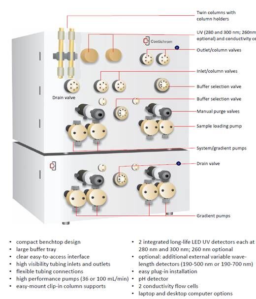 ChromaCon公司位于瑞士蘇黎世,是一家致力于層析設(shè)備及層析技術(shù)開發(fā)的企業(yè),其自主研發(fā)的Contichrom系列層析系統(tǒng),為一系列可用于連續(xù)純化的全自動層析系統(tǒng)。