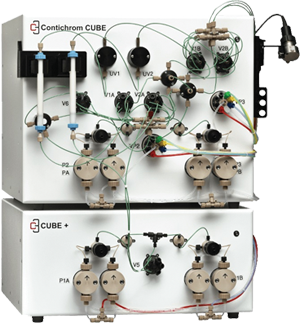 所有的Contichrom系統(tǒng)可以將兩個(gè)層析步驟(例如捕獲和精純)整合為一個(gè)單一的過程,第一步層析洗脫的產(chǎn)物可以直接被稀釋,從而直接進(jìn)行第二步層析,因此省略了中間的間歇過程,這是非常適用于高通量純化的。